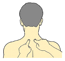 ツボの見つけ方 頭を思いきり前方に傾けたとき、いちばん高く突き出る首の骨から手の指幅1本分外側のところが治喘のツボ。アレルギーに効く大椎は、左右の治喘の中間で少し上にある。 治療のコツ 指圧治療がよい。発作中は、まずせきや胸の苦しさをとることを目的にツボを押す。左右の人さし指であまり力を入れずにツボを押す。発作がおさまっているときは、ホットパックや蒸しタオルで背中や胸を温めてから、同様に指圧する。 その後、大人なら米粒半分ほどのもぐさで、3〜5壮(1壮は1回)灸をすえると効果的。 |