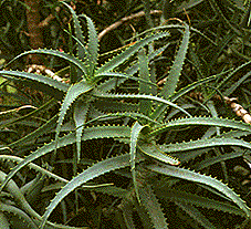 [生薬名] 蘆薈(ろかい) [特徴] 原産地は南アフリ力。エジプト王朝時代から薬として用いられていた。日本では大正初期から観賞用として広まり、のちに薬草としても知られるようになった。 [薬用部と薬効] 葉――下剤、健胃、やけど [採取と用い方] 生の葉をすりおろした汁を、少量服用する。やけどには葉の中のゼリー状の部分を貼る。