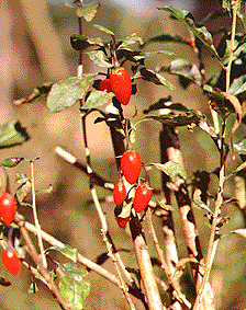 [生薬名] 枸杞葉(くこよう:葉)、枸杞子(くこし:果実)、地骨皮(じこつぴ:根の皮) [特徴] 野原や道端に多い落葉低木。枝には小さなトゲがある。春と秋の2回芽を出し、夏に淡紫紅色の小花、秋に卵形の赤い実をつける。 [薬用部と薬効] 葉、実――滋養強壮 根――消炎、利尿 [採取と用い方] 若葉は、水洗いしたのち日干しにし、保存。使用のつど、炒ってお茶に。実は秋に採り、枸杞酒にする。根は秋に採取し、乾燥させ、漢方薬にする。