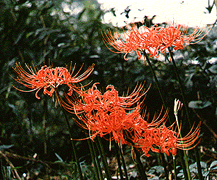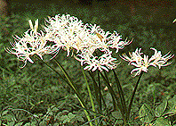 [生薬名] 石蒜(せきさん) [特徴] マンジュシャゲともいわれる。秋にまっ赤な花が咲く。林、道端、墓地などいたるところに見かける。地下の鱗茎はスイセンと似ている。 [薬用部と薬効] 鱗茎――腫(は)れもの、吐剤、肩こり [採取と用い方] 地下から掘り出し、陶器のおろし器ですりおろした汁をぬる。煎じ汁(せんじじる)は吐剤になるが、毒性が強いので、服用には医師の指示が必要。肩こりには、就寝前にすりおろしたものを両足の土踏まずに貼って包帯をしておく。