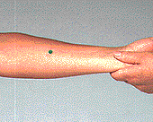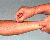 [3]つまむ さわってみて、だいたい見当のついたところの皮膚を、つまみ上げてみます。それから親指と人さし指で2〜3回もんでください。探していたツボなら、そのときに刃物で切られたような、刺すような痛みを感じて体がぴくつき、反応するはずです。 もし、そのような痛みを感じなかったら、少しずつ位置を変えて探します。ツボを探すときは、左右とも同様にして調べてください。 |