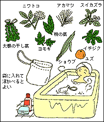薬草や身近な食べ物を入れた薬湯で、入浴の効果が高まります。体が温まり、血行をよくするので、冷え症、肩こりなどに効くだけでなく、美容にも効果的です。 薬草は、生の葉や茎を摘んできて用いても、漢方薬局などで買い求めた乾燥葉を使用してもかまいません。 日本手ぬぐいのようなもめん布を使って袋を作り、これに薬湯料を入れると便利です。 袋に詰めた薬草を風呂に入れ、水から沸かすのが一般的な用い方です。 赤唐辛子、ユズ、ミョウガなどを使う場合は、沸いた湯に浮かべます。 また、スイカズラ湯などは、前もって乾燥葉を煎(せん)じておき、沸かした湯に入れます。 |