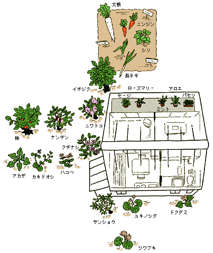 薬効のある植物で、観賞用や食用にも適した種類を選んで、庭に植えると、実用性と楽しみの両面を満たすことができます。各シーズンをそれぞれ彩り、薬効も偏らない組み合わせを考えるとよいでしょう。山野で採取した薬草は、自生していた場所に似た条件のところに植えます。