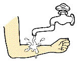 傷口を水で洗う。傷口の土や砂は強めの流水でとり除く。とれないときは、ガーゼで軽くこすりとる | |