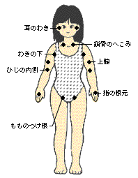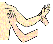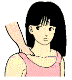 | 傷口に清潔なガーゼやハンカチをあて、強く押さえる。強めに包帯をしてもよい。傷口を心臓より高い位置にもっていくと止血しやすい | 肩や腕の上部の出血は、鎖骨のくぼみを下へ向かって押すように圧迫する。止血点の場所を覚えれば便利 | |