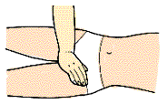 | 指の出血は、指の根元を両方の横側からグッと押さえて、止血する | 足の出血は、手のひらをあてて体重をかけるようにして、もものつけ根を圧迫する | 上腕部、前腕部の出血は、わきの下に親指をあて、強く圧迫する | ||