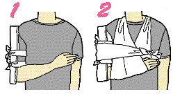 1 肩からひじまでの長さの副木(そえぎ)をあて、包帯で固定する 2 たたんだ三角巾で腕をつり、必要があれば胴体に結ぶ。骨折部を押し上げないよう注意 |