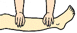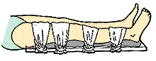 ひざの骨折 臀部(でんぶ)からつま先までの副木をあて、ひざの裏に十分あてものを入れる |