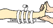 ひじの骨折 わきの下から指先までの副木をあてる。副木は長さ、幅、かたさとも十分に必要。板切れ、ダンボール、傘なども利用できる。包帯はスカ一フ、ネクタイ、ストッキングでも代用できる |