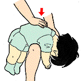 | 頭を低くさせ、胸に手をあて、もう片方の手で背中の肩甲骨の間を数回たたく | みぞおちに握りこぶしをあててかかえ、両腕を締めてグッと引き上げる | 子供の場合は、腕やひざにうつ伏せにのせ、背中を思いきりたたく | ||